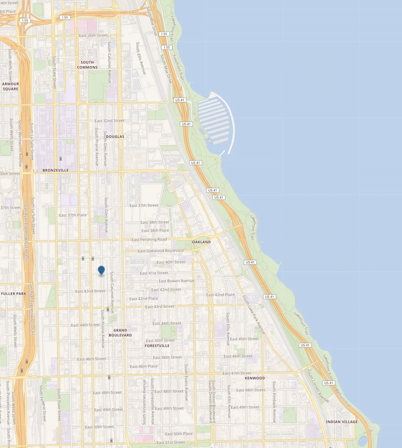 To the east sits 39th Street Beach. Just west of there are the Metra Electric train tracks and former Michael Reese Hospital site, currently set to receive infrastructure investment for Bronzeville Lakefront, a new, mixed-use health innovation district.